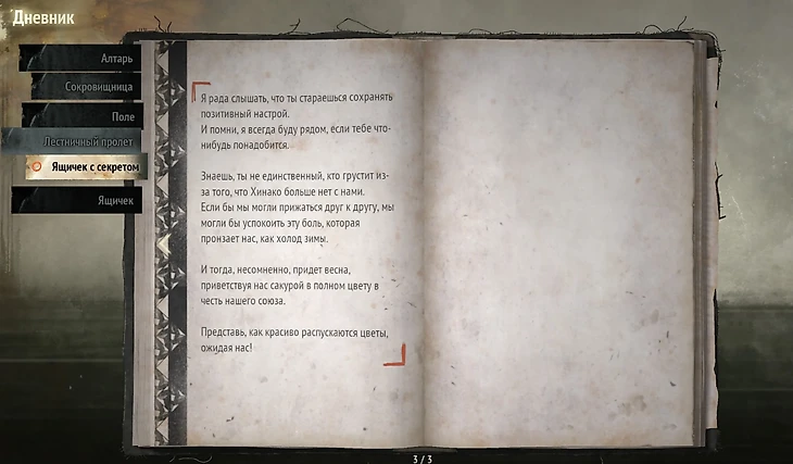 Ориентироваться следует на любовные записки Ринко к Сю. Первое послание лежит на столе рядом со шкатулкой. После того как вы откроете ящик впервые, получите второе письмо, затем третье и, наконец, финальное – в награду за завершение головоломки. Всего записок четыре: три из них содержат подсказки для решения, а последняя служит эпилогом этой небольшой истории.