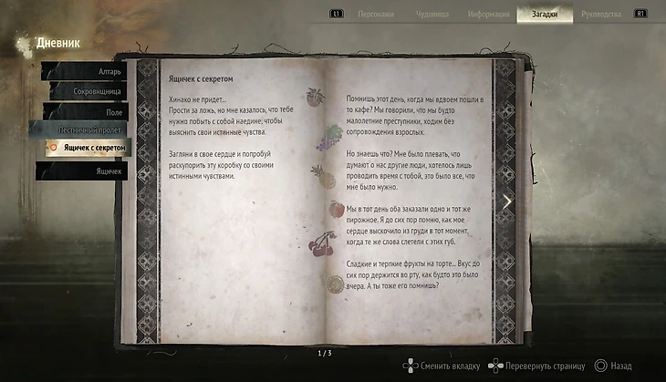В первой записке важен этот фрагмент: «Помнишь этот день, когда мы вдвоем пошли в то кафе? Мы говорили, что мы будто малолетние преступники, ходим без сопровождения взрослых. Но знаешь что? Мне было плевать, что думают о нас другие люди, хотелось лишь проводить время с тобой, это было все, что мне было нужно. Мы в тот день оба заказали одно и то же пирожное. Я до сих пор помню, как мое сердце выскочили из груди в тот момент, когда те же слова слетели с этих губ. Сладкие и терпкие фрукты на торте... Вкус до сих пор держится во рту, как будто это было вчера. А ты тоже его помнишь?».