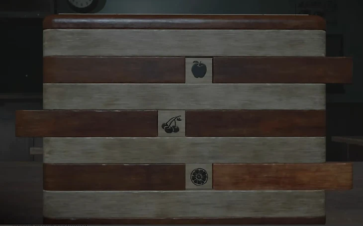 На первой стороне ящичка нужно открыть изображение вишни, для этого нужно подвинуть четвертую дощечку