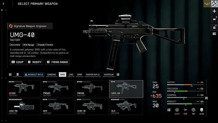 Описание: UMG-40 — универсальный ПП с хорошим контролем отдачи и приемлемой дальностью для своего класса. Отличный выбор для тех, кто хочет сочетать агрессию у углов с возможностью подчищать цели на средней дистанции без пересадки на штурмовую винтовку.
