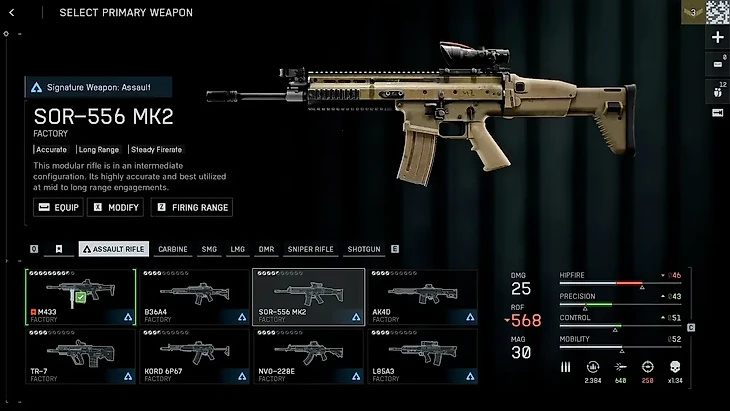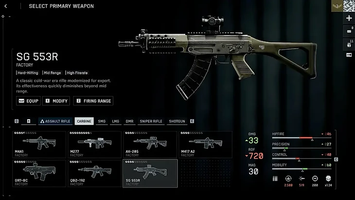 Описание: SG 553R — один из самых мощных карабинов в Battlefield 6. Его высокая убойная сила и хорошая управляемость делают оружие идеальным для городских карт и ближних боев. Требует разблокировки через испытание, но полностью оправдывает усилия игрока.
