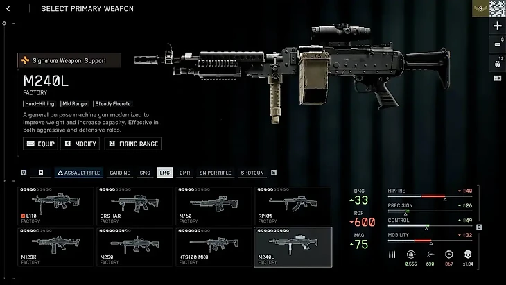Описание: M240L — надежный универсал среди пулеметов: хороший урон, предсказуемая отдача и адекватный боезапас делают его эффективным в самых разных сценариях. Разблокировка через ассигнмент того стоит — M240L быстро становится рабочей лошадкой вашей инженерной или поддерживающей сборки.