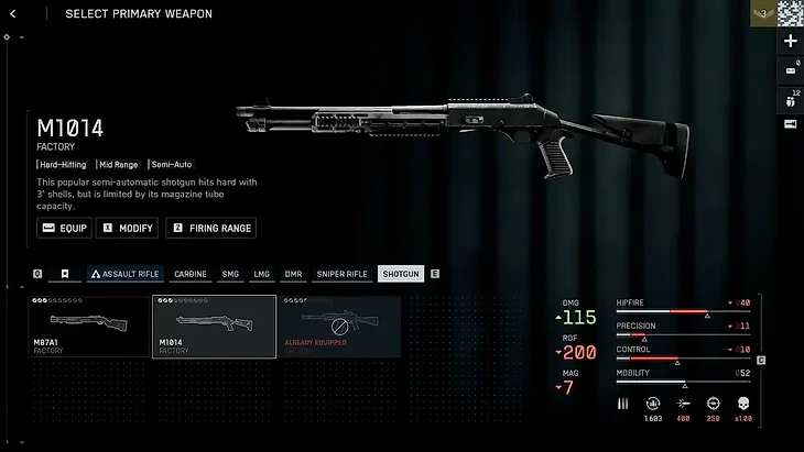 Описание: Полуавтоматический дробовик, который сочетает стабильную скорострельность и мощное пробитие. M1014 эффективен в узких коридорах и при штурме точек. При установке патронов Slug способен поражать цели даже на средней дистанции.
