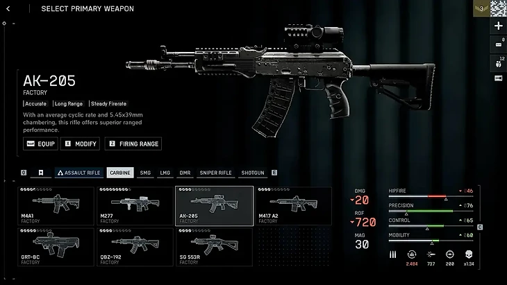 Описание: AK-205 — карабин с упором на стабильность и контроль. Плавная отдача и высокая точность делают его отличным выбором для стрельбы с дистанции. При правильных модулях превращается в надежный дальнобойный инструмент, который одинаково полезен в соло и командной игре.
