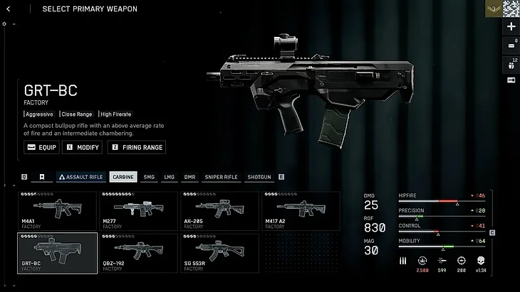 Описание: GRT-BC — компактный буллпап-карабин с отличной маневренностью. Обеспечивает хорошую точность при движении и высокую скорострельность, что делает его подходящим для динамичного штурмового геймплея. Оптимален для игроков, предпочитающих агрессивный стиль.