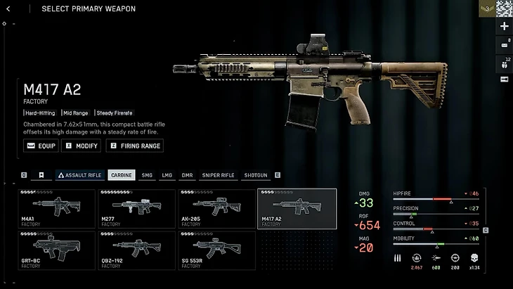 Описание: M417 A2 — тяжелый карабин под мощный патрон 7.62×51 мм. Высокий урон компенсируется ровной скорострельностью и низкой отдачей. Идеален для тех, кто предпочитает точные, уверенные выстрелы вместо «спрея» на бегу.