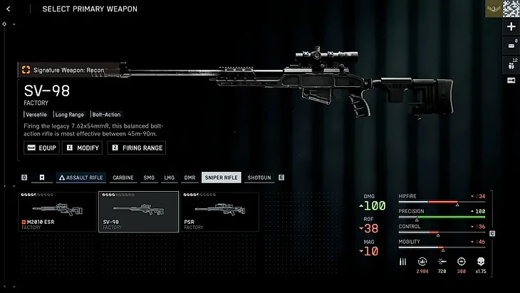 Описание: Классическая болтовая снайперская винтовка с отличной стабильностью и надежным уроном. СВ-98 оптимальна на дистанциях 45–90 метров и идеально подходит тем, кто хочет точную и предсказуемую механику стрельбы без сложных модификаций.