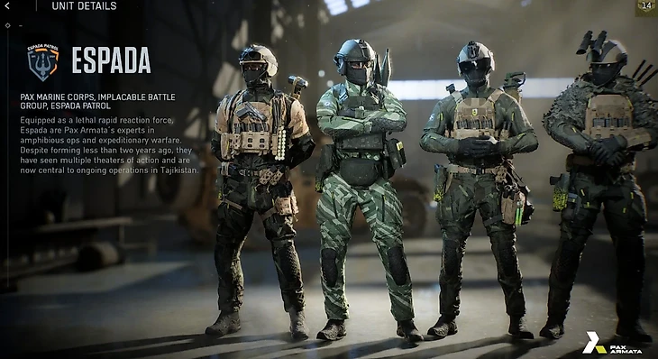 «Эспада» – многонациональная команда Pax Armata, ключевой игрок в таджикистанских конфликтах. Коричневые разгрузочные жилеты и темно-зеленая униформа идеальны для горных операций, подчеркивая адаптивность и силу.