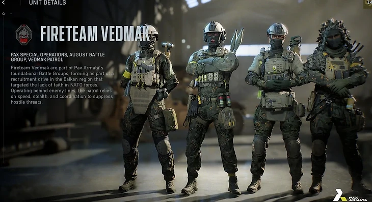 Подразделение «Ведмак» собрано из балканских рекрутов Pax Armata, мастеров скорости и незаметности. Оливковая экипировка с зеленым камуфляжем помогает растворятся в листве. Скины мастерства здесь, как и у «Койотов», открываются через классовые испытания, предлагая радикальные изменения облика.