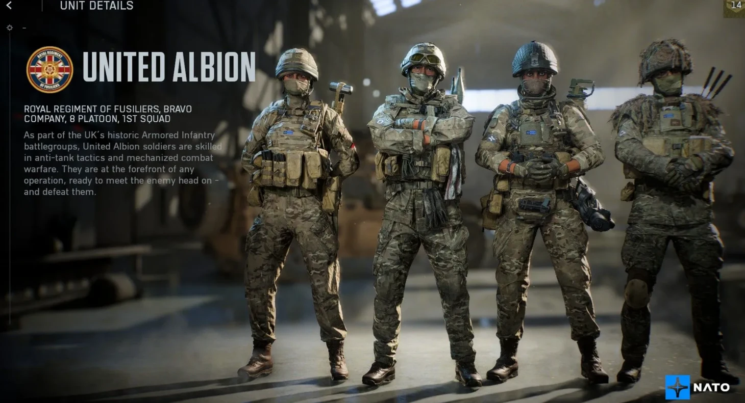 «Объединенный Альбион» представляет британских солдат, облаченных в приглушенный камуфляж Multicam. Подобно «Койотам», каждый боец здесь имеет уникальную предысторию. Эти скины идеальны для тех, кто хочет добавить нотку британского стиля в миссии.
