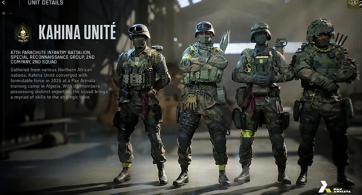 Подразделение «Кахина» состоит из североафриканских бойцов с алжирскими корнями, специализирующихся на десантных операциях. Экипировка приспособлена для пиренейских театров, добавляя элитарности и мобильности.