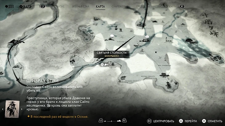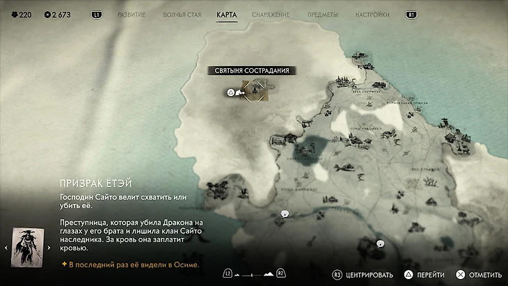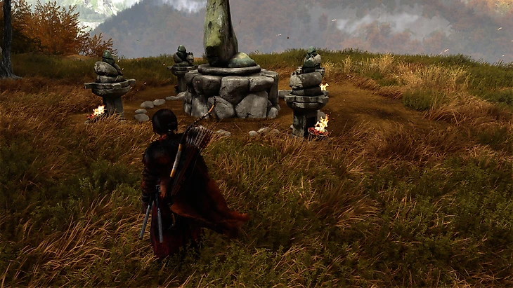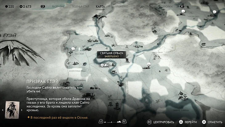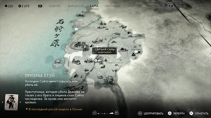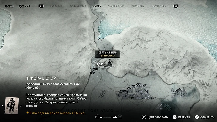 Первая Святыня в Ghost of Yotei расположена в центре стартового региона, немного западнее трактира, рядом с рекой Сарубэцу. Вам нужно найти густые зеленые заросли, в центре которых находится поляна с алтарем, символизирующим гору Етэй. Вокруг него, на достаточно большом расстоянии, расположены четыре статуи, ориентированные по сторонам света – север, юг, восток и запад, относительно алтаря.