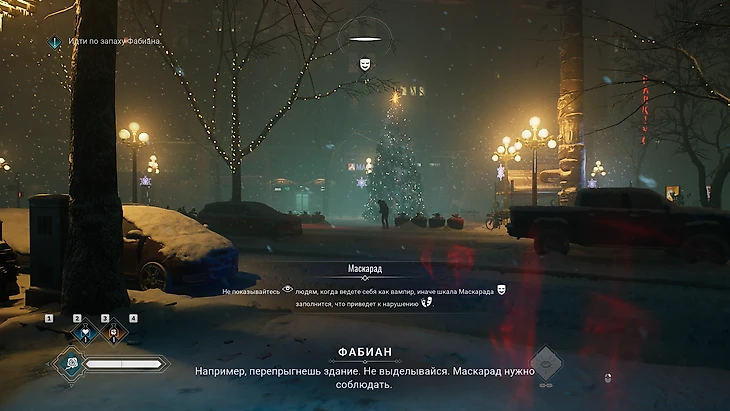 Визуально игра выглядит добротно, но не более. Предновогодний Сиэтл с гирляндами и снегом держит атмосферу. Текстуры местами мыльные, но общая картинка приятная. Лицевые анимации приличные, нарезать на мемы не получится. А вот музыка действительно хороша и создает правильное настроение вампирского города.