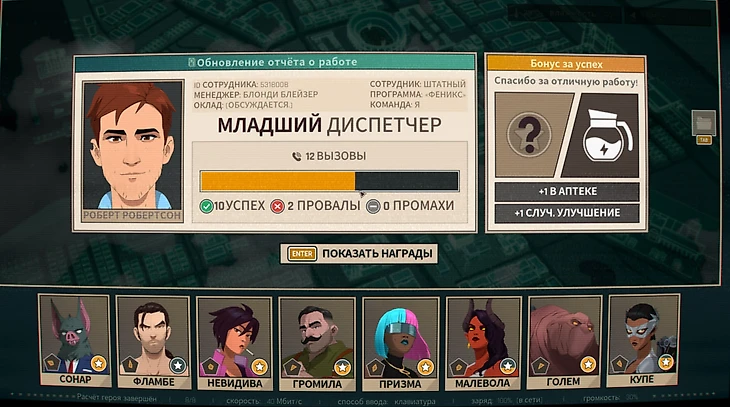 Работа диспетчером звучит скромно, но скучно тут не будет. В первый рабочий день Роберт отправляет подопечных на вызовы, учитывая их сильные и слабые стороны. У каждого из восьми героев пять показателей: бесстрашие, стойкость, ловкость, харизма и интеллект.