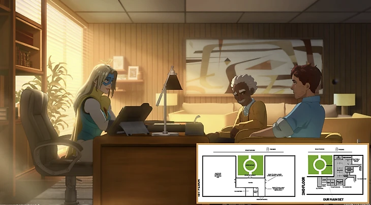 Офис нарисован в ретро-стиле 90-х с приглушенной цветовой палитрой. Вышло уютно и с легким налетом фанка. Разработчики создали настоящие план-схемы, где все должно быть логично: расположения кухни, зоны отдыха, конференц-зала и даже лифта.