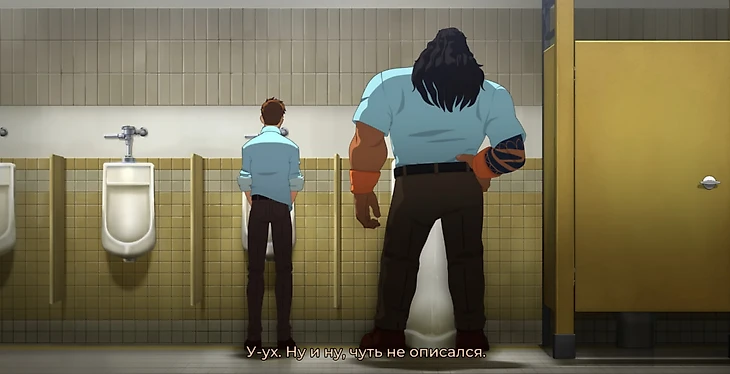 ● В первый рабочий день Роберт писает в туалете и встречает коллегу-здоровяка. Тот тоже облегчается и протягивает приветственный кулачок – в такой момент думаешь, стоит ли его касаться… Решил по-пацански не брезговать. Мы мило пообщались, после чего узнал, как справлять нужду, не касаясь чибрика.