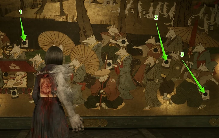 Кульминационная головоломка с фреской становится доступной после тщательного изучения ключевых областей игры. Монументальное изображение запечатлело торжественную процессию кицунэ, сопровождающих высокопоставленную персону. Среди девяти пустующих мест на росписи лишь три предназначены для геральдических символов. Главная сложность заключается в определении верной последовательности их размещения. В данном руководстве представлены точные комбинации для получения четырех возможных финалов.