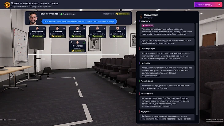 Общение с командой тоже не исправили. Диалоги усиливают реалистичные ощущения управления коллективом, но им часто не хватает логичности. Например, я решил продать 33-летнего бразильца Каземиро, который терял скиллы и откусывал 350 тысяч евро в неделю из зарплатной ведомости. Ответ команды, что называется, убил. Ко мне пришел капитан Бруну Фернандеш и заявил, что деньги и уровень игры не имеют значения, ведь Каземиро важен в раздевалке.