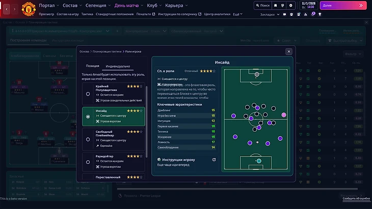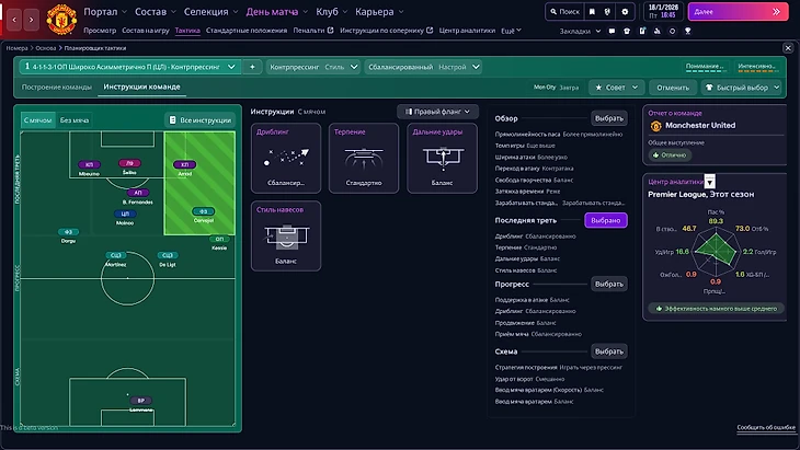 Новая тактика работает, хотя тратит немного больше времени, чем раньше. Расстановка и роли в обороне помогают еще точнее распределить обязанности игроков после потери мяча. Конечно, вы не сможете сделать правого вингера левым защитником (игра увидит большую разницу в позициях и предупредит об этом), но современные подключения латералей, прессингующие или, наоборот, свободные действия нападающих и адекватные смещения игроков с позиций теперь доступны каждому.