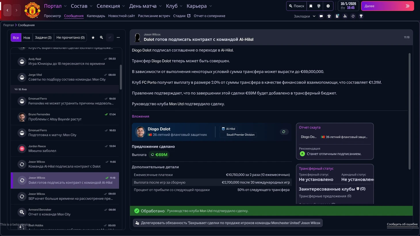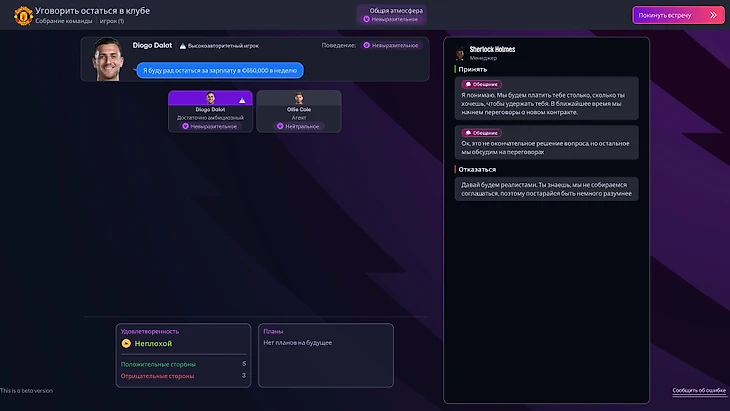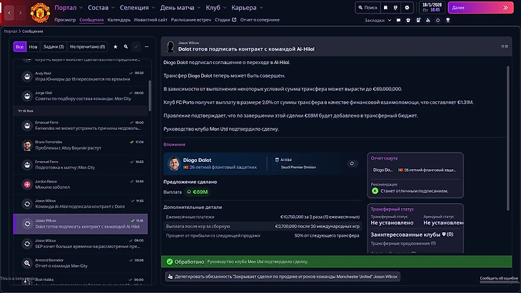 Другая забавная ситуация случилась с Диогу Далотом. В начале сезона португалец запросил (и получил) новый контракт, но уже зимой поставил ультиматум о переходе в саудовскую лигу. Никакие доводы о целях команды или важности авторитета игрока не сработали. Похожий номер выкинул ассистент менеджера, который ежедневно помогал мне с клубом. Ну, и где здесь реализм?