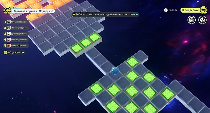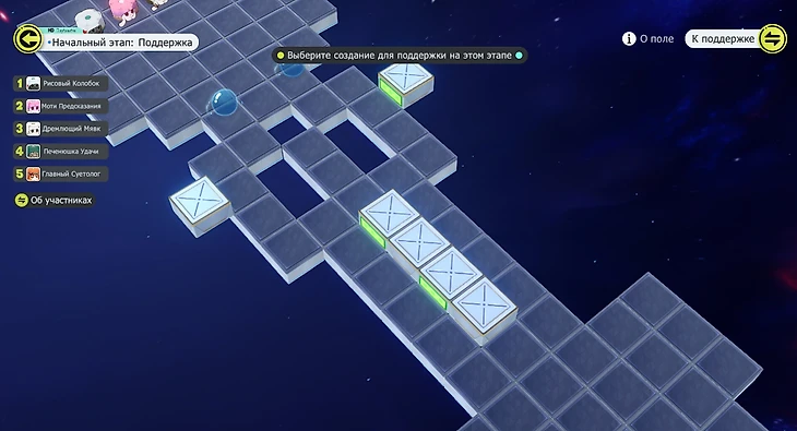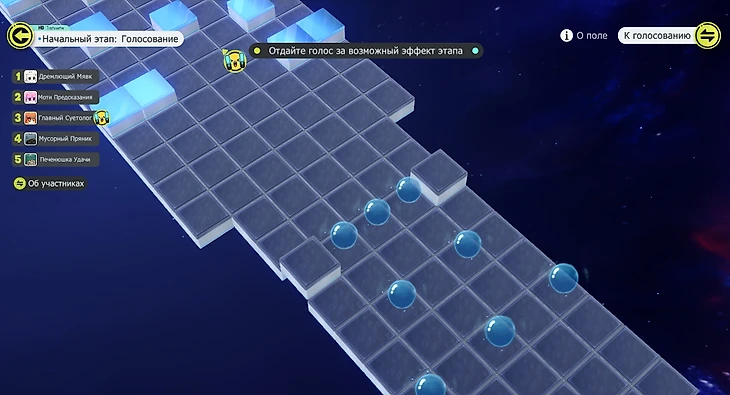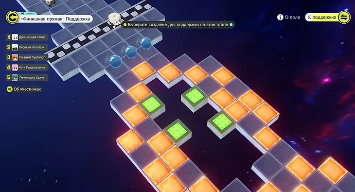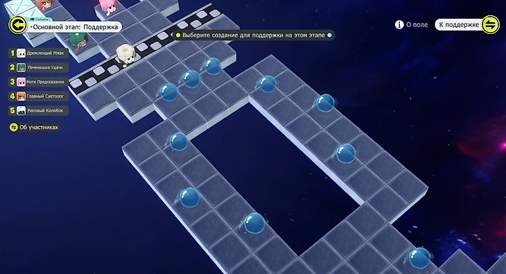 На поле много скользящих платформ, на которые может запрыгнуть Главный суетолог, а также есть препятствия в виде пузырей. Игра предлагает Дремлющего мявка, но на него поставят все, поэтому можно выбрать Суетолога или Моти предсказания. Выберите эффект поля «Разворот вихря» и не забывайте спамить препятствиями для других персонажей.