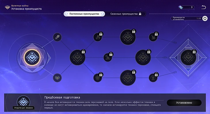 После успешного завершения забега вы получаете равноценные алмазные банкноты – особую валюту для прокачки древа умений. Это дерево называется конфигурацией преимуществ.