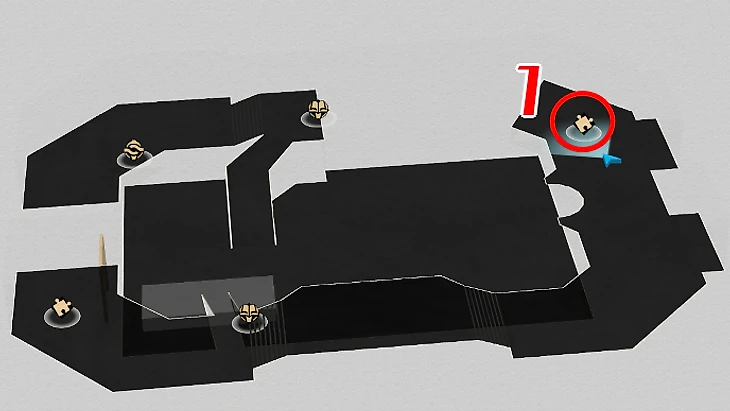 От ворот выполните комбинацию: 2 влево, 1 вправо и вниз, 3 вправо, 1 влево с поворотом вправо дважды, затем 3 влево и 2 влево. Спустившись в левую дыру, прыгните с желтой плитки слева. По лестнице дойдите до следующего желтого люка, нажмите синюю кнопку, подойдите к правому краю и упадите в открывшуюся яму. Прямо к алтарю и сундуку в придачу.
