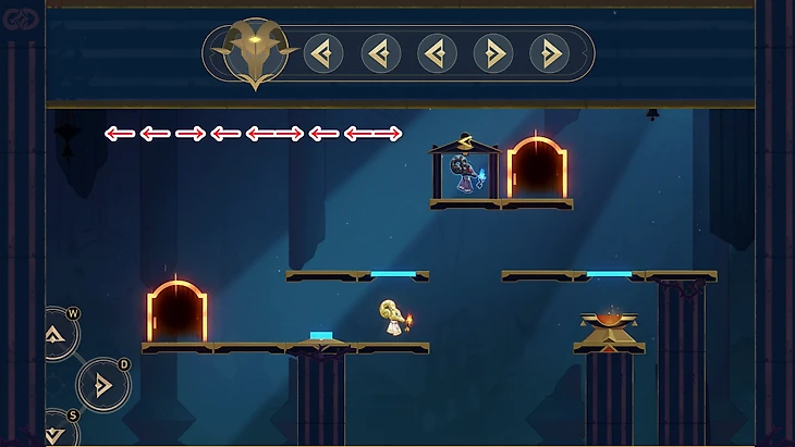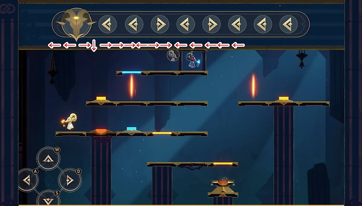 С пятью ходами в запасе следуйте: 2 влево, 1 вправо, 2 влево с поворотом вправо, еще 2 влево с поворотом вправо. Прыгните на левую платформу и встаньте на голубую плитку. Спустившись слева, активируйте синюю кнопку, войдите в портал и упадите вправо на алтарь. Теневая сущность не успеет вмешаться, а сундук ждет вас.