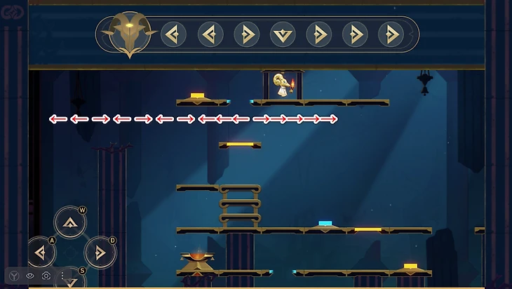 В сумеречном зале начните с последовательности: 3 шага влево, 1 вниз, 2 вправо и 1 влево. Затем продолжите 5-ю шагами влево, прыжком вверх и 2 влево. Достигните желтой плитки, спуститесь по лестнице, прыгните с правой платформы и двигайтесь влево до подъема. Поднимитесь по ступеням и подойдите к алтарю. Не забудьте открыть сундук с сокровищами по завершении!