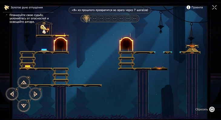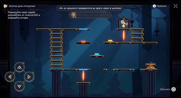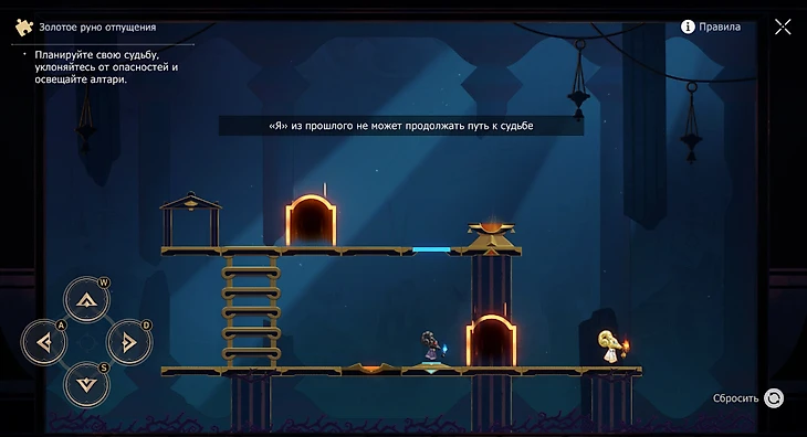 Появится руно из прошлого. Поднимайтесь и опускайтесь по лестнице с желтой кнопкой вверх и вниз дважды, пока Я из прошлого не встанет внизу, тогда идите на голубую кнопку направо.