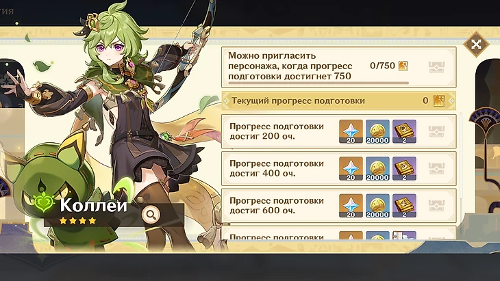 Главный приз за 750 единиц Прогресса подготовки – бесплатная Коллеи. Дендро лучница может играть роль второстепенного дамагера, нанося урон из кармана.