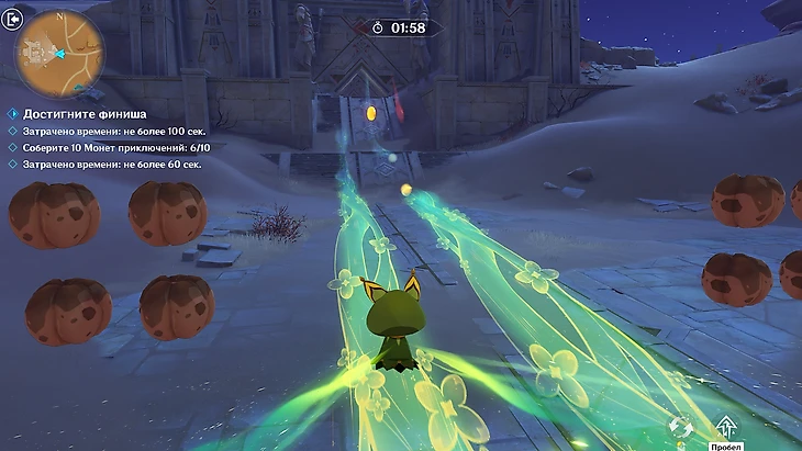 В итоге разгадчик бежит через точку с заморозкой, дважды прыгает с помощью подъема и затем добегает до финиша.
