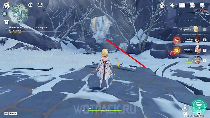 Когда все три фрагмента активированы, остается финальная часть квеста – подъем к вершине Драконьего хребта. Следуйте маркеру, пройдите через пещеру с хиличурлами и поднимайтесь вверх по заснеженным уступам. Соберите Анемогранумы, чтобы подняться воздушным потоком на платформу, где появится сцена с тремя парящими кристаллами льда.
