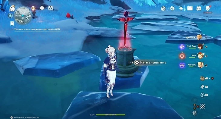 Чтобы запустить квест и понять, как проходить первую часть, направляйтесь к подножию Драконьего хребта. Возле входа расположилась искательница приключений Юй Ся. После короткого разговора она отправит вас изучать странный замерзший лед, который не реагирует на обычный Пиро урон.