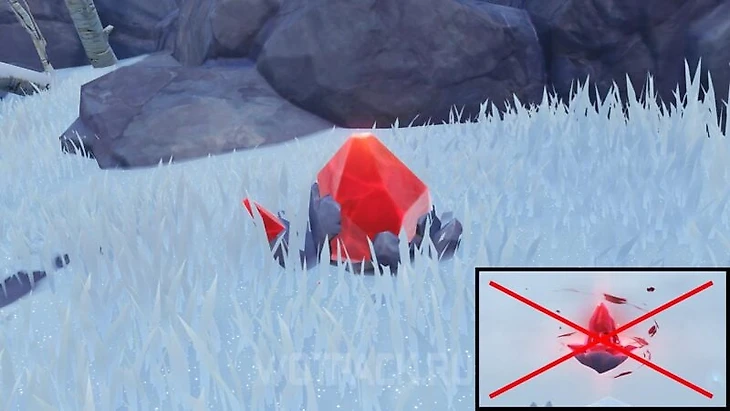 Этот фрагмент расположен недалеко от начала пути. Как только выйдете к массивной голубой ледяной плите, осмотрите окрестности: здесь разбросано несколько залежей Алого кварца. Они появляются: