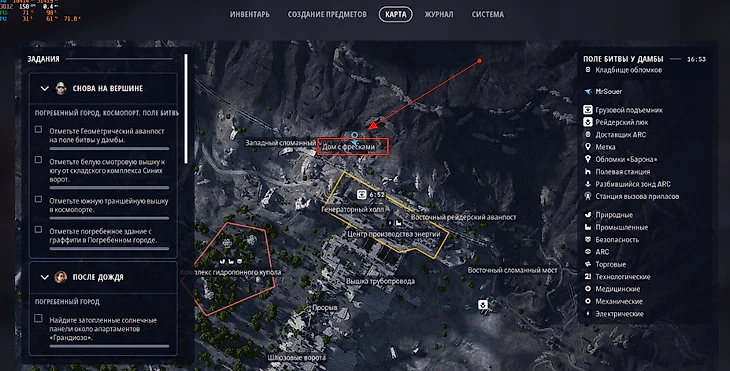 Первую подсказку в вашем творческом приключении стоит искать на карте «Боевые Дамбы». Направляйтесь в крайнюю северную часть, где стоит впечатляющий «Дом с Фресками» — здание, которое выделяется среди прочих своим декором. Присмотритесь к внешним стенам на 1 этаже: там появится заметное желтое уведомление, приглашающее к взаимодействию. Нанесите рисунок краской, и вот – первая отметка сделана. .