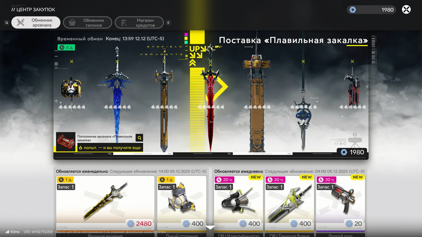 Оружейный баннер расположен в обменнике, где можно тратить билеты арсенала (выдаются с каждой круткой). На нем повышенный (25%) шанс получить оружие ивентового персонажа, а также могут выпасть еще 6 стандартных шестизвездочных оружий (с шансом 12,5%).