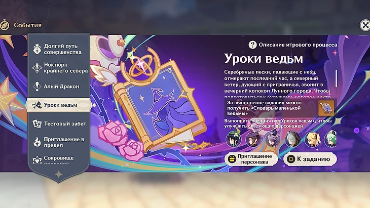 После беседы получите: камни истока × 20, книги опыта героя × 3, мора × 30000 и Словарь маленькой ведьмы.