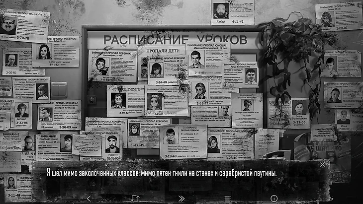 Пройдя по коридору, Антон ощутил во рту привкус гнили, а на доске к портретам пропавших Кати и Семена добавились сотни других фотографий: «Черные распечатки клеили одну поверх другой. Жуткий коллаж из детских лиц глядел провалами глаз».