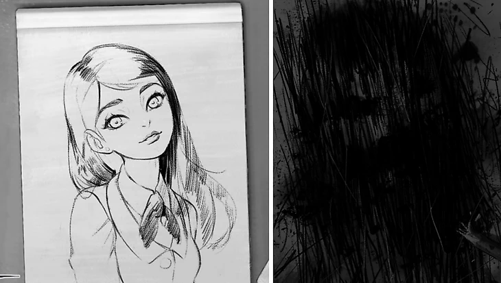 Но светлую галлюцинацию сменяет темная – вместо портрета на листке было страшное месиво. В мгновение все одноклассники и Полина пропали, школа стала заброшенной и пугающей.
