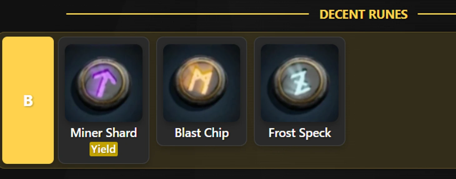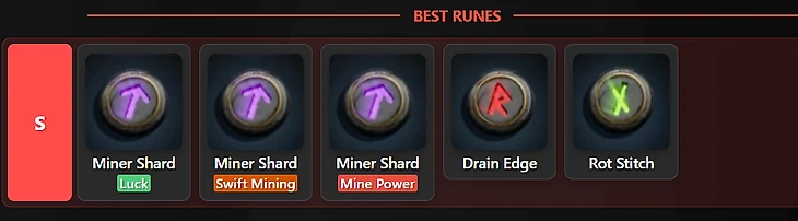 Miner Shard (Осколок Шахтера) – Luck, Mine Power, Swift Mining, Yield. Лучшая руна для кирок. Каждая ее вариация усиливает добычу: скорость, силу, шанс получить дополнительную руду или удачу.