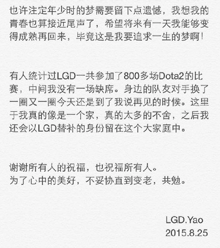 During the post-TI shuffle, there are always a few moments that really pull at the heartstrings of fans. For some it's learning that rOtk is moving to LGD. For others, it was watching fellow players join xiao8 on valentines day.The most recent one is Yao 'Yao' Zhengzheng 's heartfelt message about his decision to step down from LGD Gaming as a main player. Thanks to Liquiddota user Monv18hao, we have a translation. The original post is already very popular on weibo, amassing over 1,600 comments and 3,000 forwards.