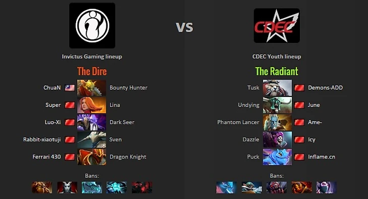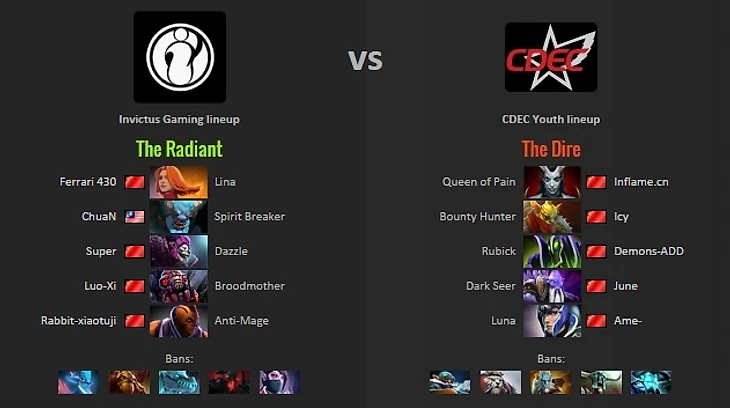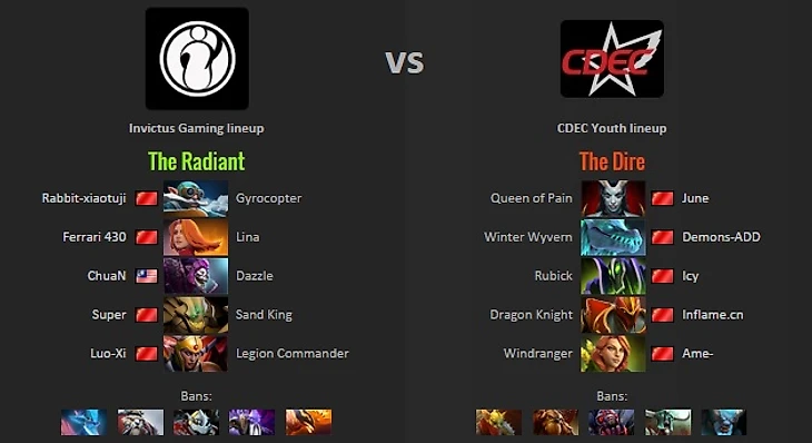 CDEC.Y and IG both had similar openings to game two. CDEC.Y picked up QOP and Winter Wyvern, whereas IG first picked Lina for the third time this series and grabbed Gyrocopter as a comfort pick for Rabbit. CDEC.Y seemed to love their Rubick as they opted for Rubick and Dragon Knight. IG chose to strengthen their mid game team fight fire power as they picked Sand King for Chuan, one of his signature heroes. Windrunner was the last pick for the young squad putting her in the untraditional position 1 for Ame, and IG went for the Legion Commander last pick.
