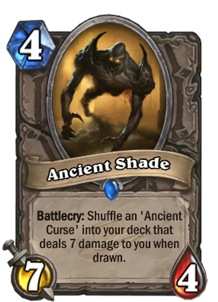 Ранкед: мне кажется, это карта типа «Сквернобота» и может вполне играть в одних с ним колодах. Тем более, она в определённой степени с ним синергична – ведь способность робота может сжечь в том числе и «Ancient Curse» и в таком случае игрок не получит урона.