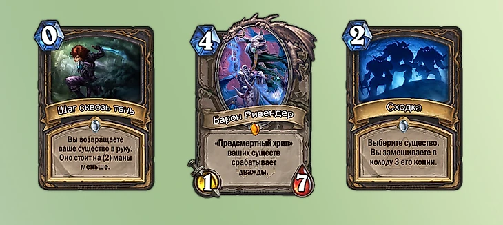В теории клонирование предсмертных хрипов на этом не заканчивается, так как мы можем использовать «Шаг сквозь тень» на первого Ящера и применить его на второго (который с 4 хрипами), получив 8 хрипов. Как вы понимаете, это тоже не предел, ведь у нас в колоде может быть 2 «Шага»! Всего же Ящер способен скопировать до 16 предсмертных хрипов.