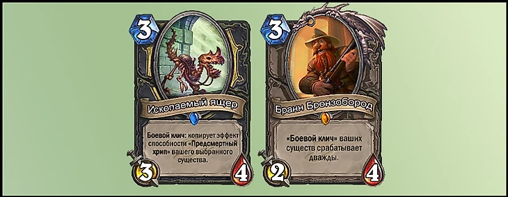 Недавно дополнение «Лига исследователей» пополнило коллекцию карт Разбойника существом «Ископаемый ящер». Его свойства при взаимодействии с таким же новым «Бранном Бронзобородом» позволяют разыгрывать очень ‘эффектные комбинации.