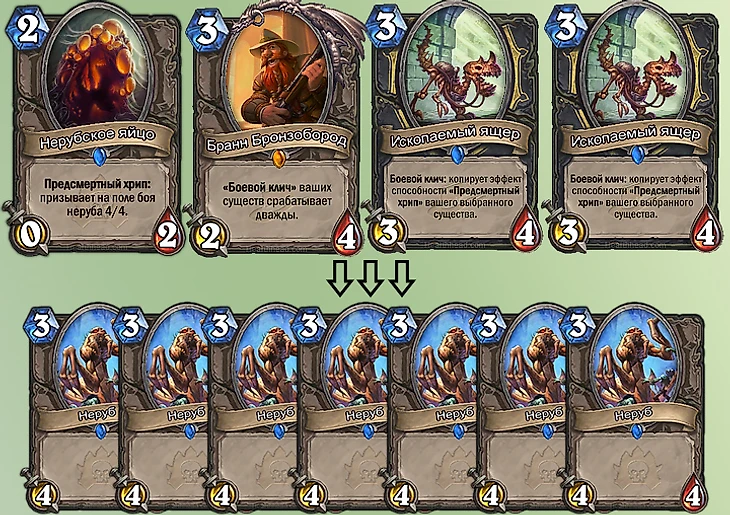 Благодаря Бронзобороду Ящер может скопировать 2 предсмертных хрипа с другого существа. Но на этом возможности комбинации не заканчиваются. Если после этих двух существ выставить еще одного Ящера, целью которого станет его близнец, то он получит уже 4 хрипа (2 у первого Ящера, умноженные на 2 Бронзобородом). Таким образом, использовав заранее поставленное Нерубийское яйцо можно получить… 7 Нерубов (1 от яйца+2 от первого Ящера+4 от второго Ящера)!