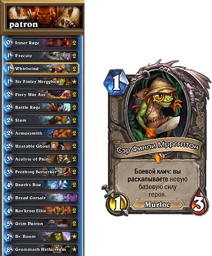 На днях я наконец-то дотянулся до обновленной версии «Патрон-Воина» с уникальной картой «Сэр Финли Мрргглтон». В этой статье я хочу порассуждать о возможностях, которые открылись для Гарроша, усиленного мурлоком.