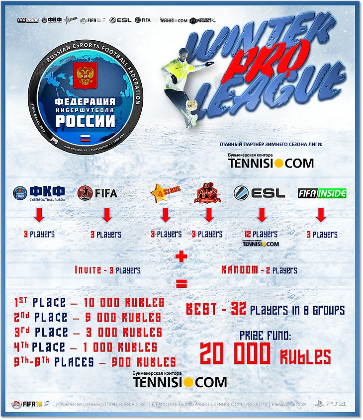 Первый зимний сезон "WINTER PRO LEAGUE" проходит при поддержке букмекерской конторы Tennisi.com, которая одна из первых даёт всем возможность делать ставки на киберфутбол и этот турнир не будет исключением, на финал WPL можно будет делать ставки и выигрывать на знание киберфутбольной сцены СНГ.
