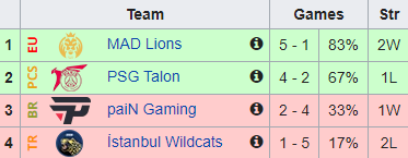 Групповой этап Mid-Season Invitational проходит с 6 по 11 мая. Команды, занявшие первые два места в группе, пройдут в следующий раунд чемпионата.